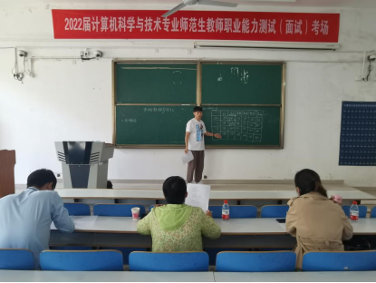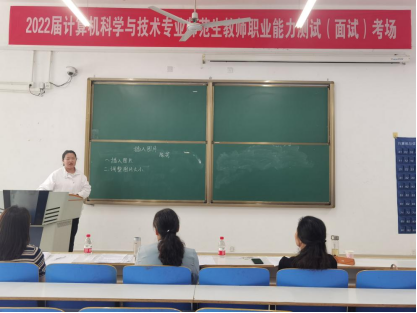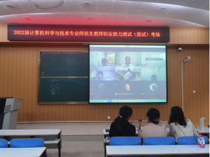 在计算机楼一楼三个教室开展了2022届计算机科学与技术专业师范生教师职业能力测试(面试)工作,共有65名师范专业学生参加了面试。因疫情原因,部分学生通过在线形式参加面试。