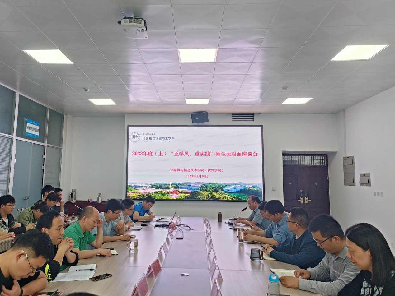 在计科楼203会议室召开“正学风 重实践”师生面对面座谈会。学院班子全体成员、系(实验室)主任、实习实训中心主任、教学工作秘书、辅导员、各班级学生代表40余人参加了座谈会。会议由教学副院长刘道华主持。