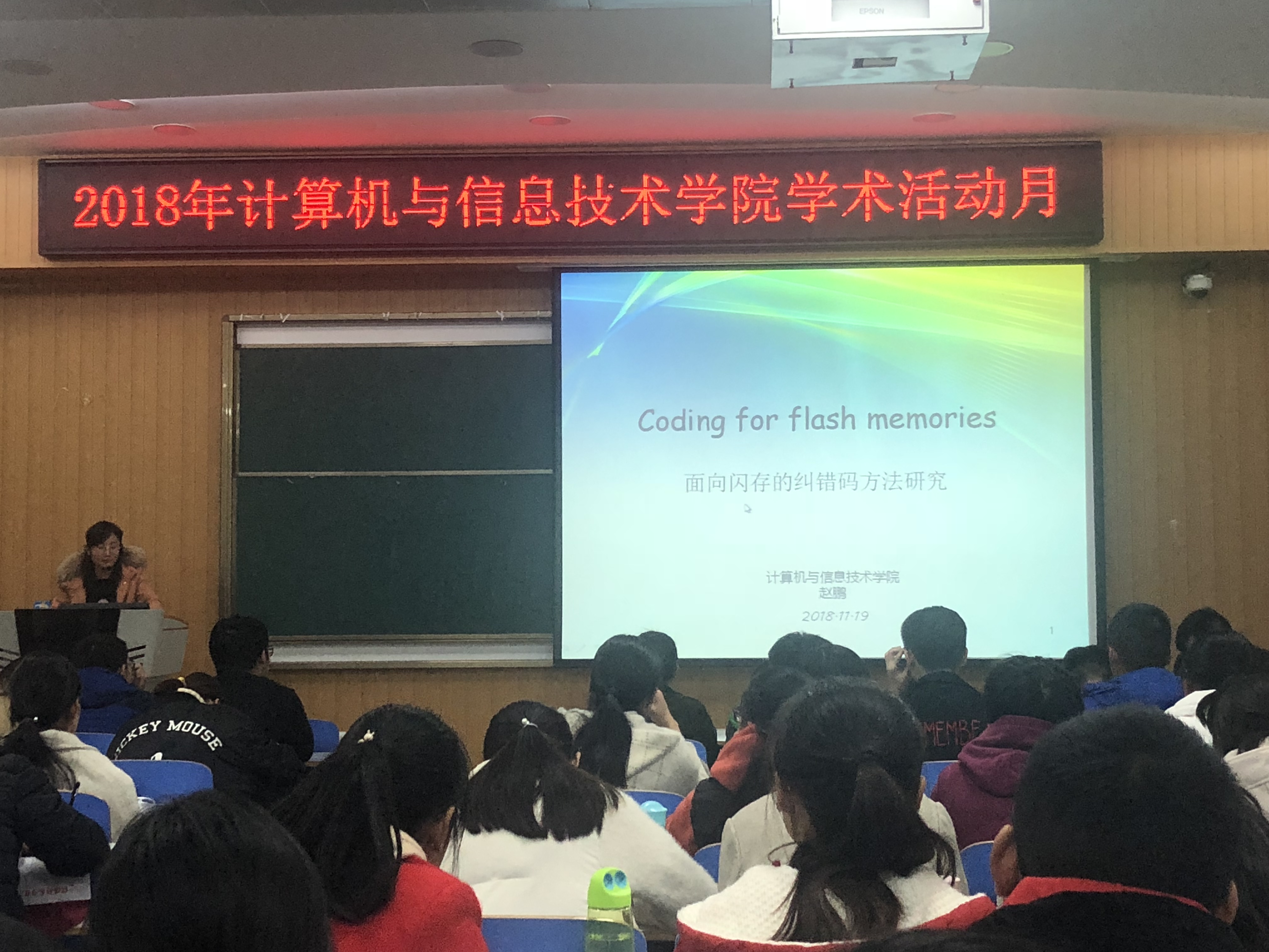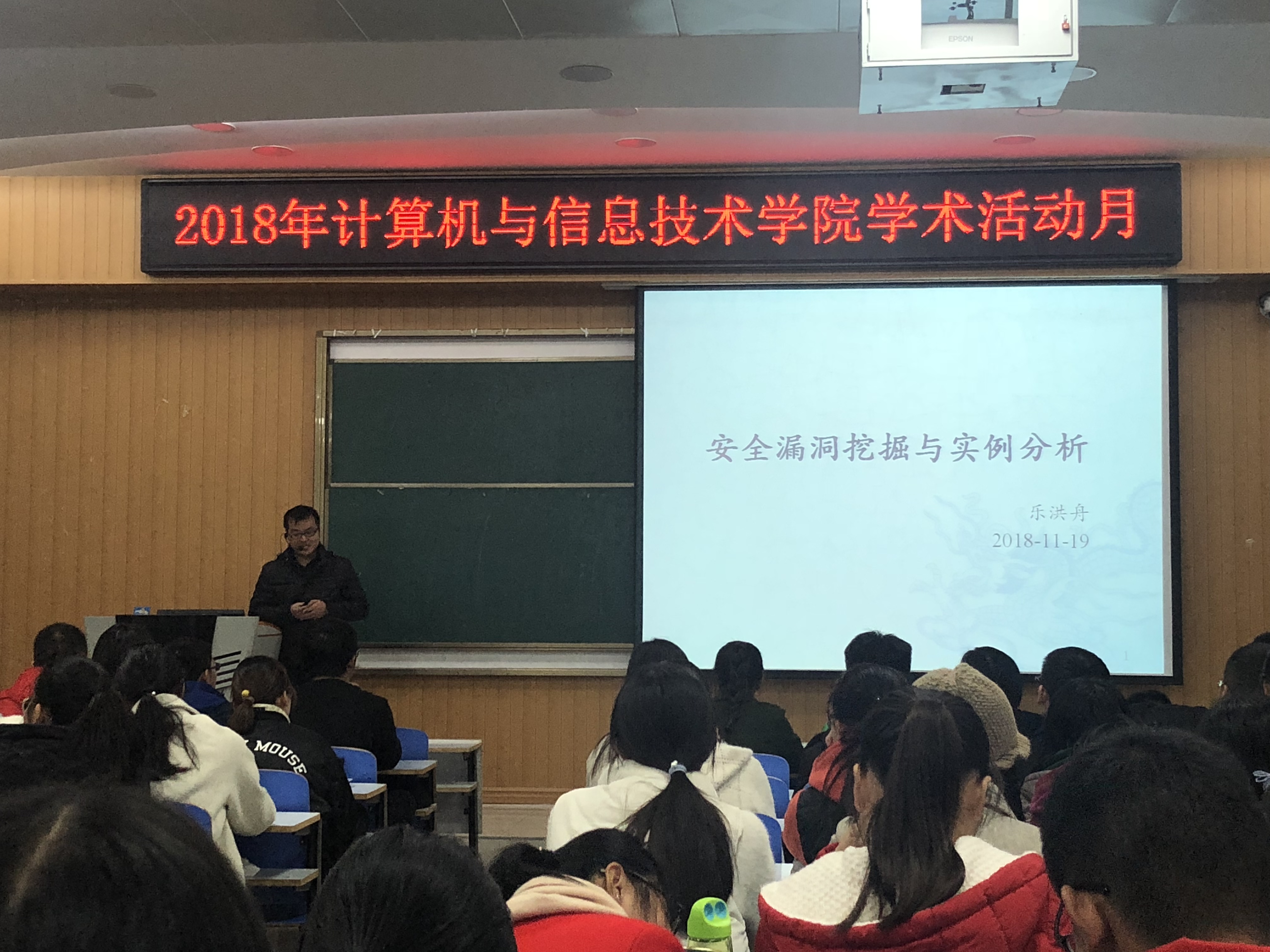 11月19日下午,信阳师范学院计算机与信息技术学院尤赵鹏、乐洪舟博士在计算机楼107教室分别作了题为“面向闪存的纠错码方法研究”和“安全漏洞挖掘与实例分析”的学术报告。计算机学院副院长黄俊、冯岩和李国梁等学院领导、学院部分教师、全体研究生以及部分本科生参加了报告会。报告会由计算机与信息技术学院副院长冯岩主持。