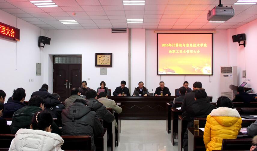 1月6日下午,计算机与信息技术学院召开了2016年民主管理大会,校工会副主席陈以根出席了大会,学院全院教职工参加了大会。大会由学院党委副书记熊炎主持。