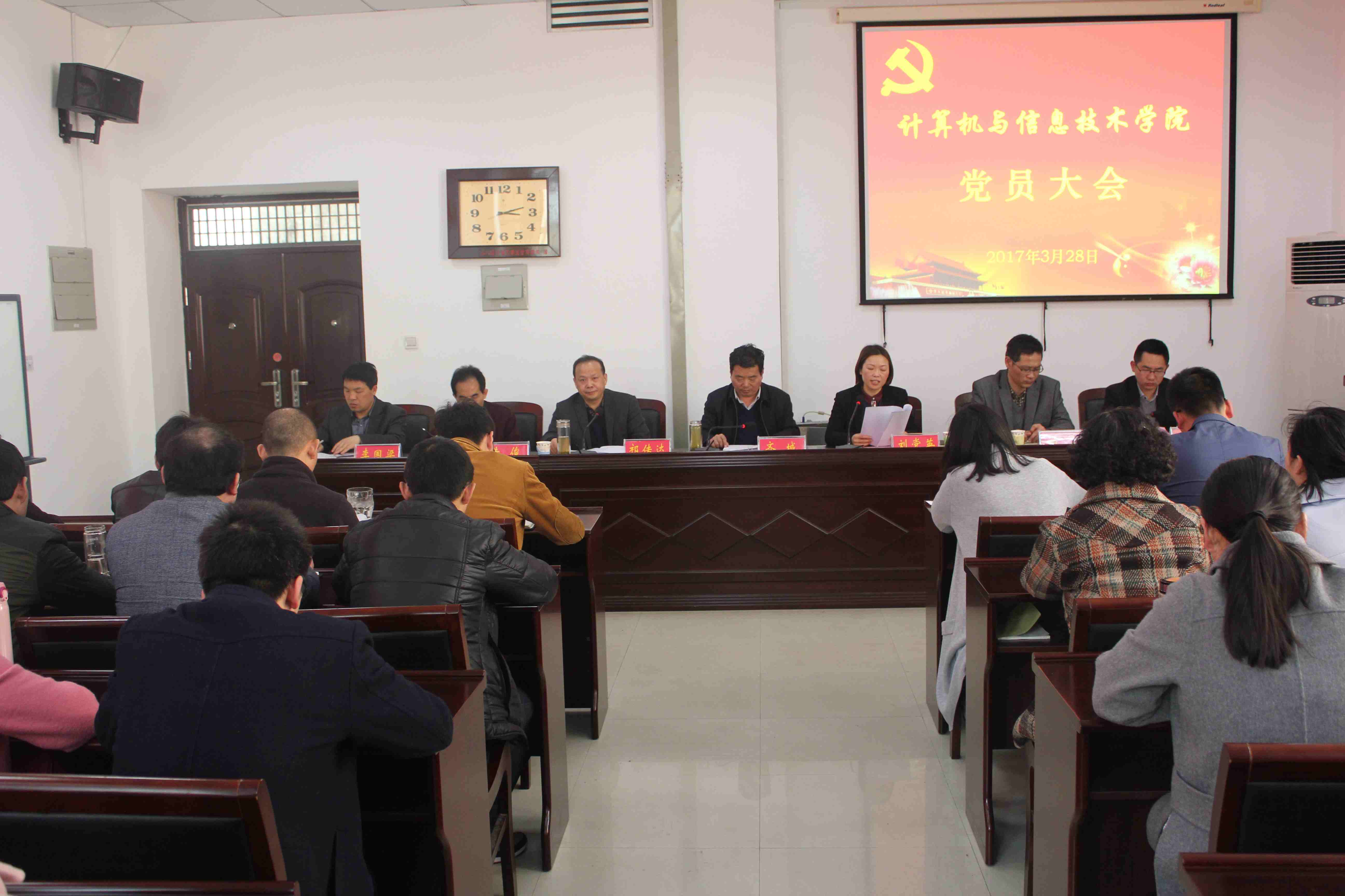 3月28日下午,计算机与信息技术学院党委换届选举党员大会在计算机楼410会议室隆重举行。副校长齐城到会指导并做重要讲话,大会由院长祁传达主持,全体教工党员和学生党员参加了大会。