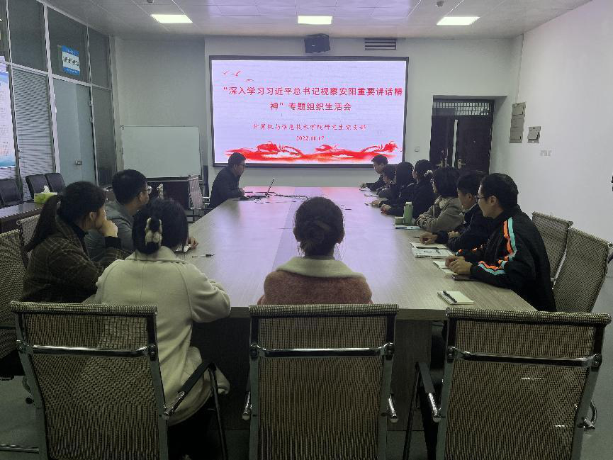 研究生党支部在计科楼203会议室召开“深入学习习近平总书记视察安阳重要讲话精神”专题组织生活会,研究生党支部全体党员参加,会议由支部书记李健主持。