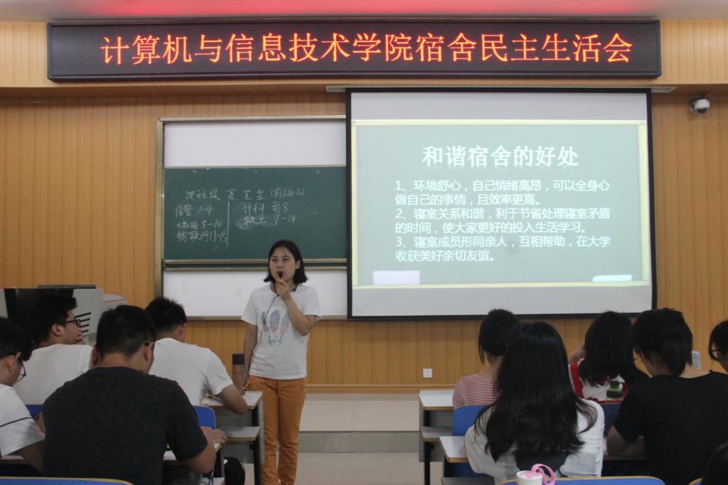 宿舍是大学生们生活和学习的重要载体,是同学们情感交流,信息沟通,思想交流的重要场所,营造健康和谐的宿舍关系对于大学生来说有着重要的意义。为营造一个更加健康和谐的宿舍环境,6月22日中午,计算机与信息技术学院于计算机楼107教室召开“宿舍民主生活会”,2018级辅导员王亚坤与2018级全体学生参加了本次会议。通过借鉴学习中国共产党的优良传统---民主生活会制度,此次会议使同学们收获满满,会议由王亚坤主持。