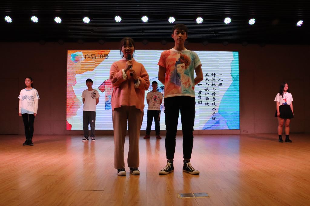 在热辣的爵士与优美的拉丁舞开场表演后,比赛正式开始。比赛分为四轮,每轮五组选手依次展示班服成品,并由解说人讲解班服设计灵感和设计意义。3号俞泖全代表队将奔腾翻涌的海浪与一轮红日相结合,碰撞出别样的美感,红日内醒目的白鹤及“美二”彰显了班级腾飞的决心。5号张智龙代表队作品以色彩绚烂的星空为底,搭配环绕着的几大星球,彰显了地理科学的专业特色,同时,白色字体“never say never”表达了班级永不言弃的精神。15号王仁的作品简洁明了,上方为班级字样,中心两边如火焰般张开的双翼的“4”象征着该班非凡的未来,下方为“MVP”体现出十足的决心与傲气。18号季芳如代表队利用了现今火爆的电影《哪吒》中的两个主人公哪吒和敖丙的形象,加上电影中的经典台词“我命由我不由天”,传达出该班学子敢与命运作斗争的坚定意志。