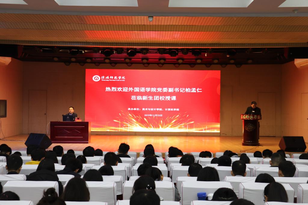 与美术与设计学院新生团校授课。美术与设计学院党委副书记杨轶中,团委老师郑波,欧乐影院
