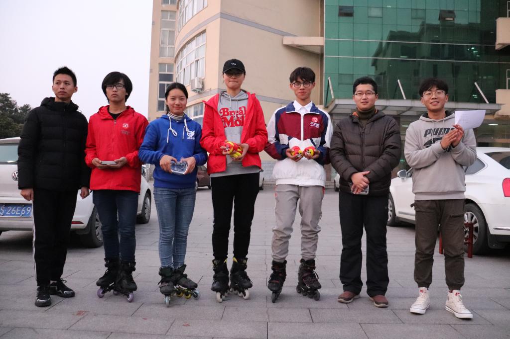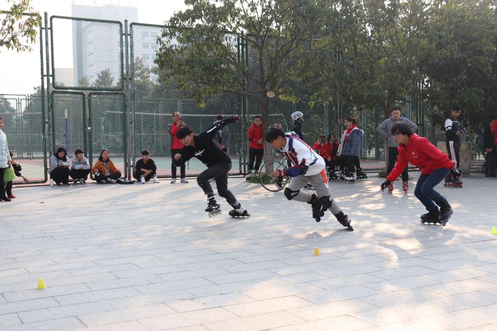 轮滑表演过后,进入比赛环节。此次比赛分为速滑和平滑两项,由现场裁判打分决定成绩。速滑比赛中,选手们齐聚赛道,弯腰快速滑行。在速滑比赛中拼尽全力,以高速度以及精湛技巧展示自己的轮滑水平。速滑比赛过后,紧接着进行了平滑比赛。每位选手进行六次平滑展示,由裁判随行监督并对其进行打分。轮滑选手凭借专业的技巧躲开每一个障碍物,酷炫的轮滑动作引得在场观众连连叫好。经评定,Crazy轮滑社杨举臣夺得男子速滑组及平滑双第一,信阳师范学院计算机与信息技术学院2019级辅导员徐崇茗为获奖选手颁奖。