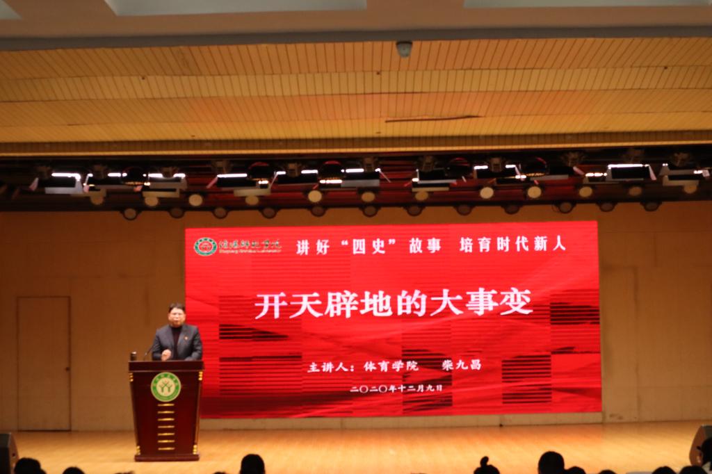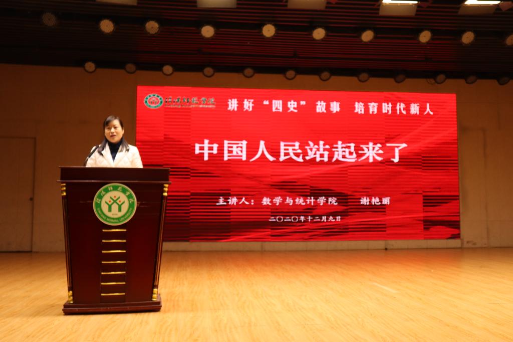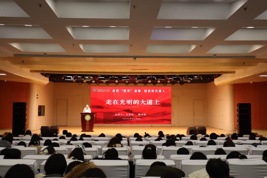 会上,熊炎首先向同学们讲解举办此次报告会的目的,为让同学们了解新中国从站起来到强起来的历史凯歌,深刻认识新中国走过来的一路坎坷,他鼓励同学们为祖国富强贡献新青年的一份力量。“德育讲师团”成员柴九昌以“开天辟地的大事变”为主题向同学们着重讲解了党史,增加了同学们对党史的认知,使其更加深刻的意识到现代美好生活的来之不易。“德育讲师团”成员谢艳丽围绕“中国人民站起来了”的主题为同学们讲解中国史,与同学们一起重温共勉了六个新中国成立后的艰苦奋斗时期,号召同学们继承并弘扬革命精神和斗争精神,为实现中华民族伟大复兴的中国梦贡献力量。“德育讲师团”成员郭子悦“走在光明的大道上”的主题讲解使同学们学习到党的十一届三中全会在我国历史上的重要意义。她呼吁同学们在迈向全面建设社会主义现代化国家的新征程上,要以一往无前的奋斗姿态、风雨无阻的精神状态,永葆“闯”的精神、“创”的劲头、“干”的作风,努力续写更多“春天的故事”,为实现中华民族伟大复兴的中国梦不懈奋斗。会议在同学们热烈的掌声中落下帷幕。