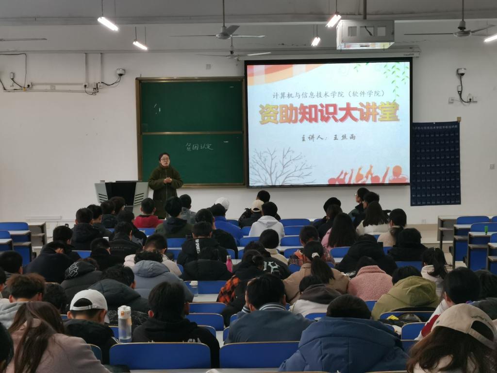 为进一步贯彻落实资助育人要求、宣传国家资助政策、加强学生诚信观念,12月2日,计算机与信息技术学院(软件学院)于计科楼104召开“资助两节课”活动之“资助知识大讲堂”。2021级新生代表参会,学院资助专员王丝雨到场讲解。