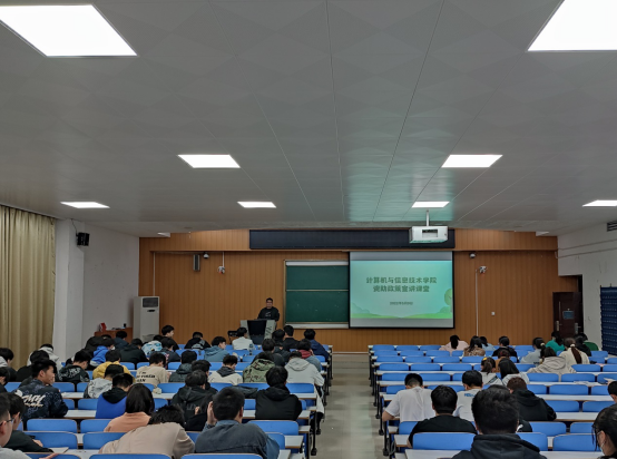 于计科楼107教室召开国家助学贷款资助政策宣讲会,辅导员刘世翔、王丝雨分别作了有关资助政策和国家助学贷款的专题讲解。