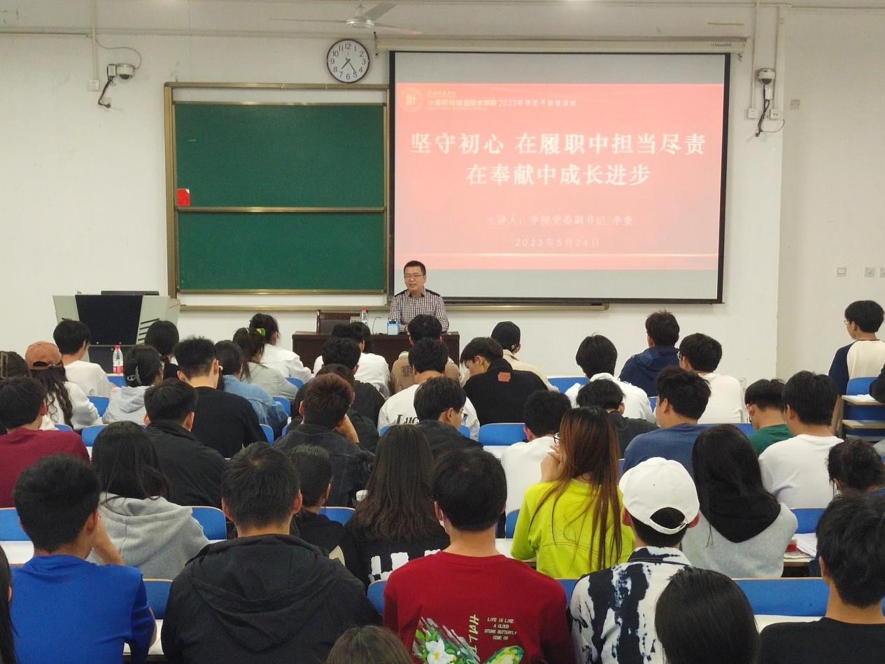 会上,李奎以“坚守初心、在履职中担当尽责、在奉献中成长进步”为主题,向同学们诠释了成为学生干部的责任与担当。他指出,习近平总书记对当代青年提出要求,“立志做有理想、敢担当、能吃苦、肯奋斗的新时代好青年”,这是党的领袖对青年一代提出的殷切希望。开展学生干部培训班,能够帮助学生干部提升能力、带好队伍,能够更好地巩固提升学生干部的能力素质,补齐短板,帮助同学们取得更高的成就。李奎对学生干部提出三点要求:作为学生干部,我们应当做一个政治过硬的人、做一个工作靠谱的人、做一个勤奋团结的人。学生干部在思想上应当学习贯彻习近平新时代中国特色社会主义思想主题教育,工作上应当做到事事有回应,件件有着落,凡事有交代,要积极认真的执行学院发派的任务。同时,学生干部也应当兼顾学习任务,做好表率,起到学习上引领作用。最后,李奎希望学生干部能珍惜岗位,做到多多付出,提升自我,有一个美好又多姿的大学生活。