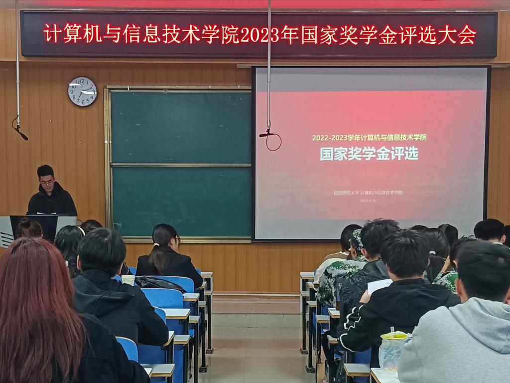 于计科楼107教室召开2023年国家奖学金评选大会。20级辅导员王丝雨、21级辅导员刘世翔、22级辅导员邹妍君和23级辅导员易雯雯出席本次会议。