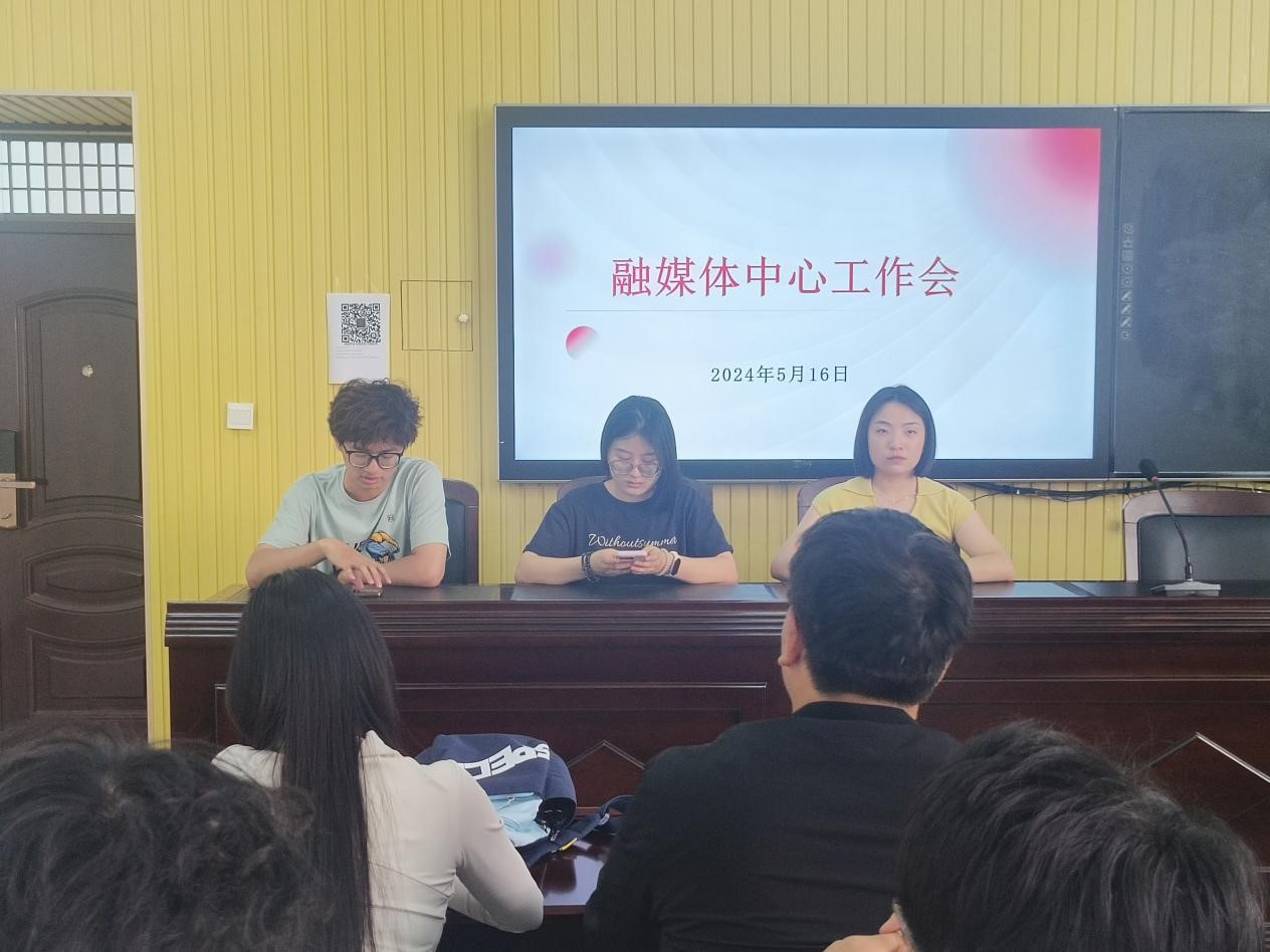 于计科楼410会议室召开融媒体中心工作推进会。学院团委老师易雯雯、团委副书记卫卓妮及各部门负责人参加会议,会议由卫卓妮主持。