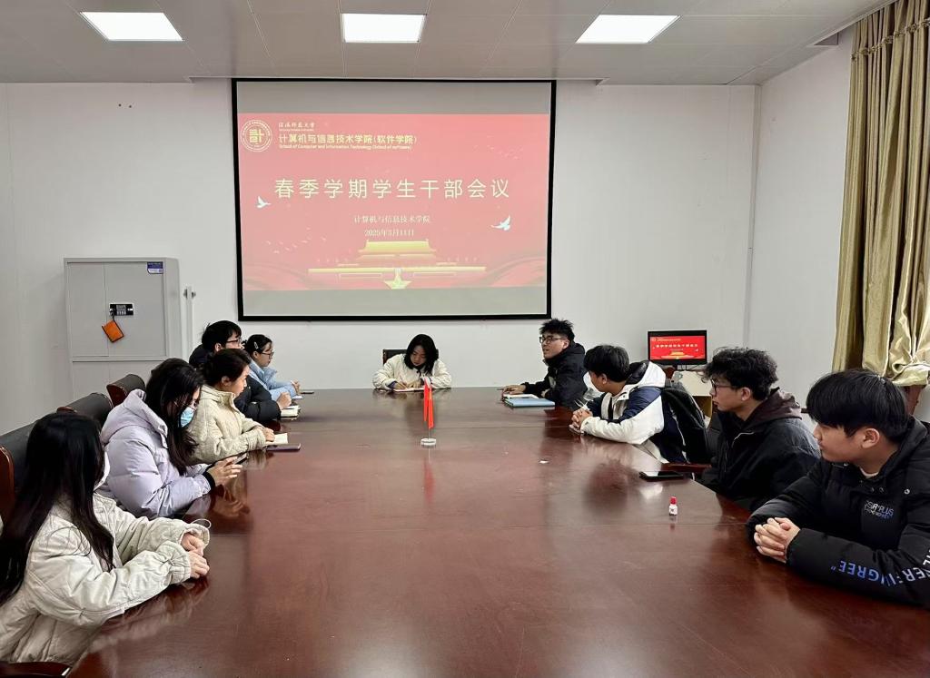 于3月11日在计科楼408会议室召开春季学期学生干部会议。团委老师易雯雯、学生会执行主席王振阳及各部门负责人参加会议。