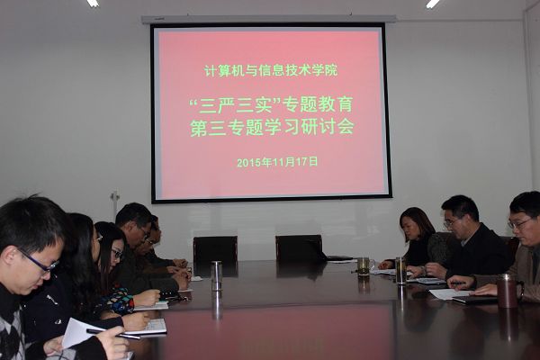 “三严三实”专题教育进入第三专题以来,计算机与信息技术学院党委高度重视,提前一周组织处级干部学习了学校《关于认真组织开展“三严三实”专题教育第三专题学习研讨的通知》,认真领会文件精神,并结合学院实际,安排部署了研讨重点要突出干事创业、谋划发展,要思考探讨单位发展的瓶颈问题,厘清发展思路,制定发展规划。