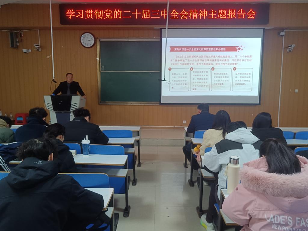 在计科楼107教室开展“学习贯彻党的二十届三中全会精神”主题报告会。校党委宣传部副部长何晓坚担任主讲人,院党委书记熊炎、副书记杨阳,教师代表,学生入党积极分子等参加报告会。