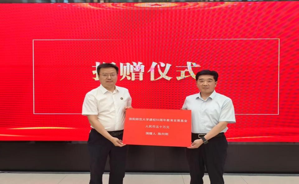 1996 级计算机专业校友、北京校友会会长陈向刚向母校捐赠建校 50 周年教育发展基金人民币 50 万元, 祝贺母校建校 50 周年,表达赤子服膺之情,江玉安代表学校接受捐赠。